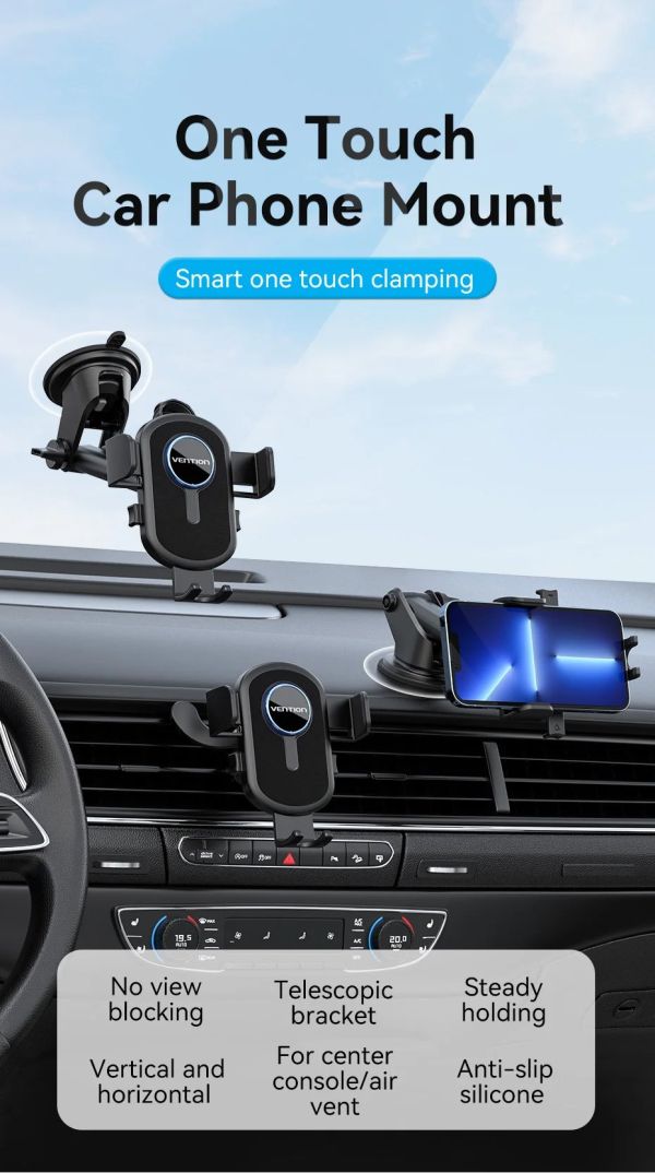 Verbessern Sie Ihr Fahrerlebnis mit der 2-in-1 Vention Autotelefonhalterung, die für eine mühelose Bedienung und sicheren Smartphone-Zugang entwickelt wurde. Diese Halterung verfügt über eine intelligente Ein-Tasten-Klemmung, die es Ihnen ermöglicht, Ihr Telefon mit nur einem Handgriff zu montieren und zu entfernen.