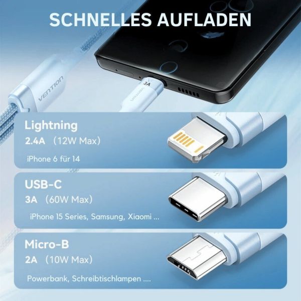 Micro USB (2A): Geeignet für ältere Android-Geräte, Xiaomi, Tablets und andere Geräte, die Micro B verwenden.