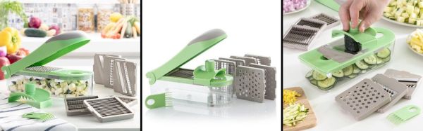 Ein vielseitiger und innovativer manueller Gemüseschneider mit Rezepten und Zubehör, der in keiner Küche fehlen darf, da er viel Zeit und Mühe spart.