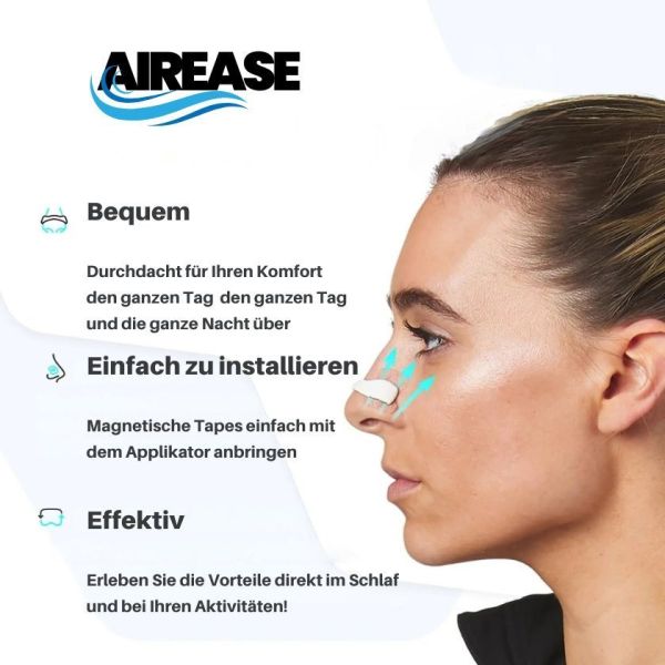 Die magnetischen Nasenpflaster AirEase™ wurden entwickelt, um sanft Ihre Nasenflügel zu öffnen, den Luftstrom zu maximieren und so für eine bessere Sauerstoffversorgung und einen erholsamen Schlaf zu sorgen.