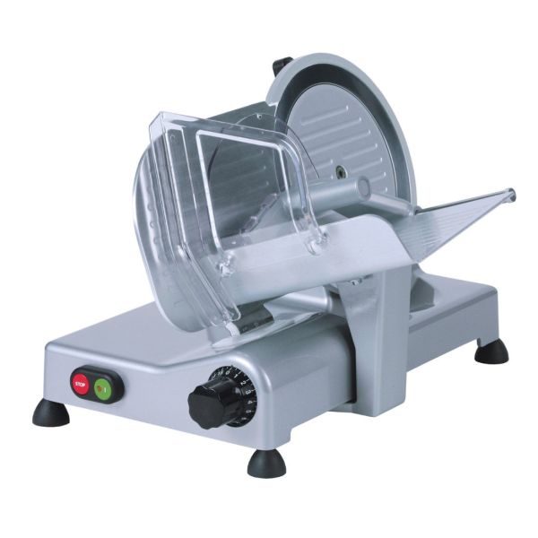 Dank ihres Asynchronmotors mit einer Leistung von 140 W bietet die Aufschnittmaschine Kraft, Schnelligkeit und Ruhe beim Schneiden. Seine Klinge aus hochwertigem, gehärtetem Edelstahl verfügt über einen Rundumschutz und ermöglicht ein einfaches Schneiden.