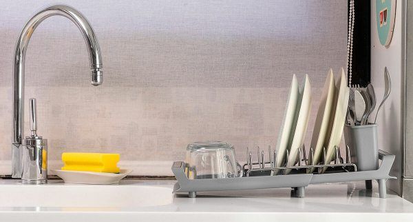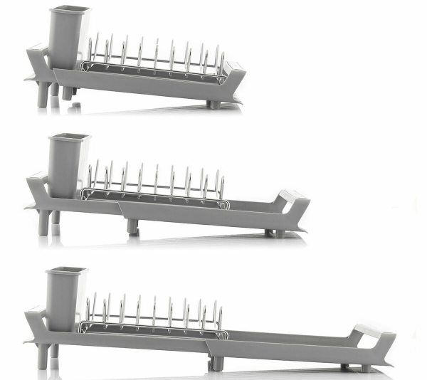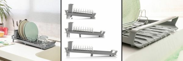 Ein sehr praktisches und flexibles, ausziehbares Geschirrabtropfgestell zum schnellen und effizienten Lufttrocknen von Tellern, Gläsern, Besteck, usw.
