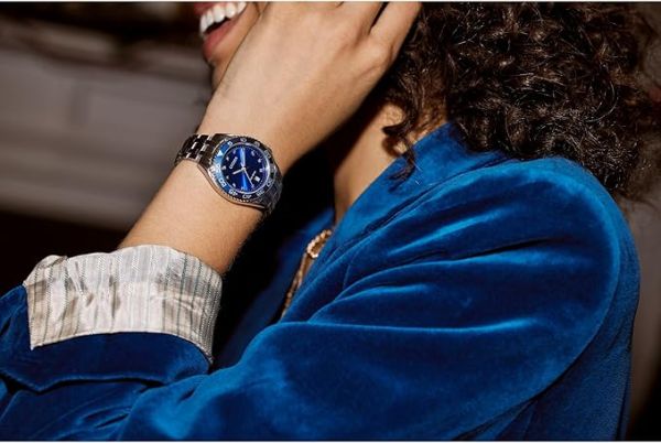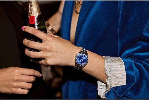 Das visuelle Erscheinungsbild dieser Uhr entspricht den technischen Leistungen. Das tiefe blaue Zifferblatt, das mit funkelnden Kristallen als Indexen verziert ist, verleiht der Uhr ein raffiniertes und feminines Aussehen. Die silberfarbenen Zeiger harmonieren perfekt mit dem blauen Hintergrund und sorgen für eine optimale Lesbarkeit sowie einen sophistizierten Stil. Ob für eine lässige Freizeitaktivität oder einen formelleren Anlass, diese Uhr passt zu jeder Gelegenheit.