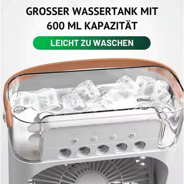 Sein 600-ml-Wassertank ist mit Eiswürfeln und Wasser gefüllt und kann stundenlang kalte Luft versprühen, um Sie kühl zu halten.