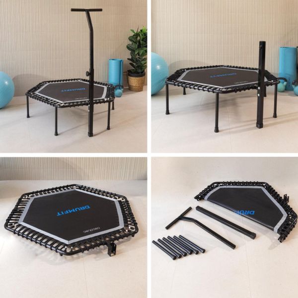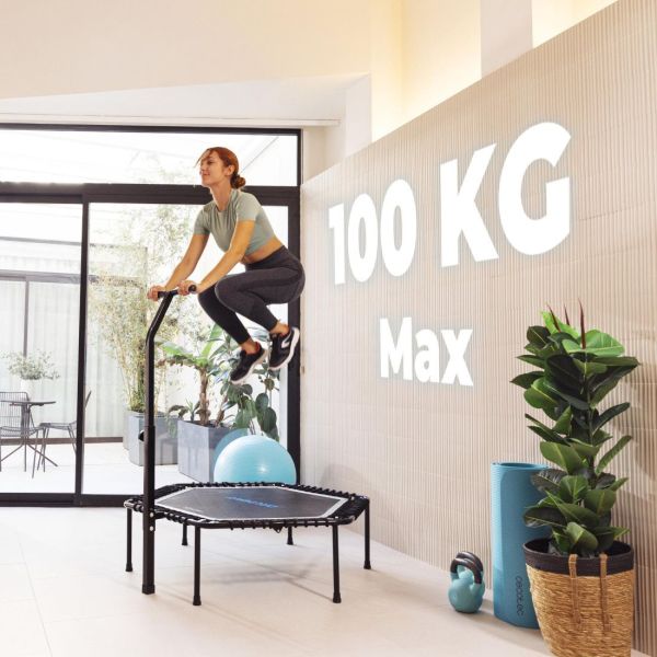 Dank der in 6 Stufen höhenverstellbaren Haltestange (von 112 bis 137 cm) kann das Trampolin individuell an die Körpergröße und den Trainingsstil angepasst werden. Diese Flexibilität sorgt für eine bequeme und sichere Haltung – perfekt sowohl für Einsteiger als auch für erfahrene Sportler. Der ergonomische Griff bietet zusätzliche Stabilität bei Sprüngen und ermöglicht abwechslungsreiche Übungen ohne Einschränkungen.