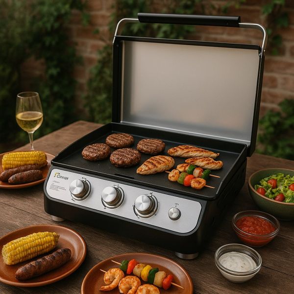 Die abnehmbare Ölwanne der Plancha erleichtert die Reinigung erheblich. Nach jedem Gebrauch können Sie das überschüssige Fett einfach entfernen, um Ihre Plancha sauber und in gutem Zustand zu halten. Der doppellagige Deckel bietet eine doppelte Funktionalität: Er hilft, die Hitze während des Kochens zu halten, was ein gleichmäßigeres Kochen ermöglicht, und schützt gleichzeitig die Kochfläche, wenn die Plancha nicht benutzt wird. Das Bedienfeld aus rostfreiem Stahl sorgt für einen Hauch von Eleganz und bietet gleichzeitig maximale Hitze- und Spritzwasserbeständigkeit.