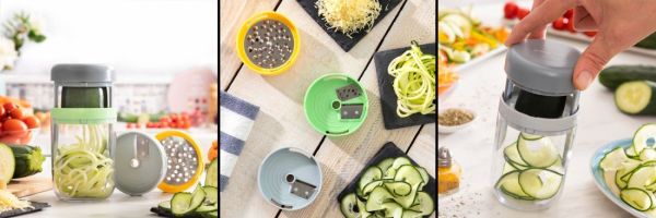 - 3 Schneidearten: Spiralbänder und Spaghetti, Reibe.