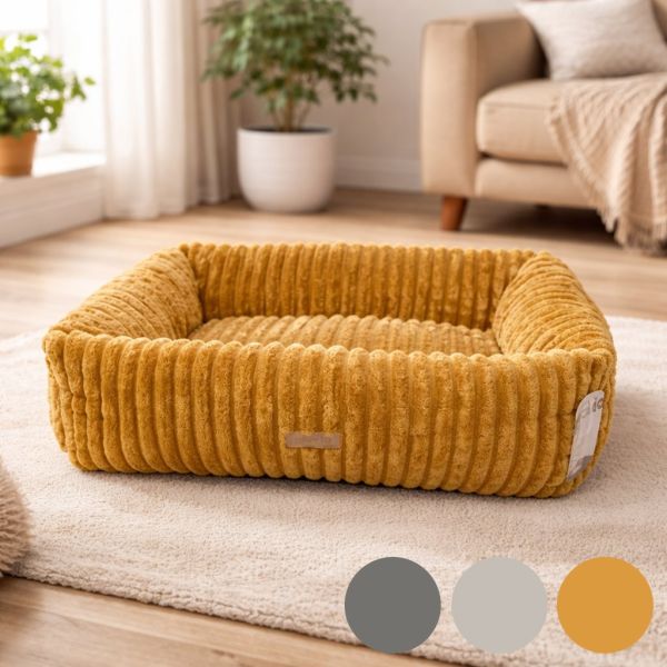 Das Hundebett Gloria ist in den Größen S, M und L erhältlich, mit frei wählbaren Abmessungen, um sich optimal an unterschiedliche Hundegrößen anzupassen. Es ist in den Farben Gelb, Hellgrau oder Dunkelgrau verfügbar und fügt sich dank seines zeitlosen Designs harmonisch in verschiedene Wohnräume ein.