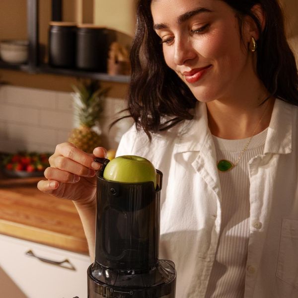 Mit seinem 200-W-DC-Motor garantiert das Gerät, dass wirklich jeder Tropfen extrahiert wird. So erzielen Sie eine optimale Saftausbeute ohne Verschwendung. Seine niedrige Drehzahl von 55 ± 5 U/min reduziert die Oxidation und sorgt für aromatische, nährstoffreiche Säfte voller Energie.