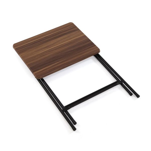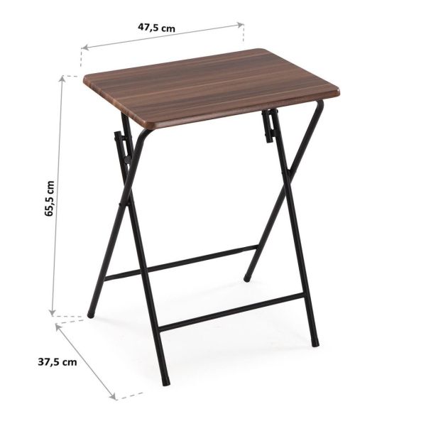 Dank seiner praktischen Maße kann dieser Tisch sowohl als Beistelltisch, Schreibtisch für den Laptop, Unterlage für schnelle Mahlzeiten oder auch als Campingtisch genutzt werden. Zusammengeklappt lässt er sich problemlos hinter einer Tür oder im Schrank verstauen.