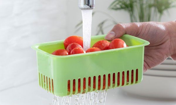 Er enthält einen abnehmbaren Abtropfkorb mit Belüftungs- und Filterlöchern, der die Luftzirkulation im Inneren für eine bessere Aufbewahrung fördert und auch zum Waschen und Abtropfen von Lebensmitteln verwendet werden kann.