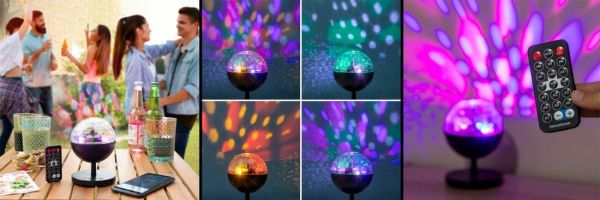 - Mehrere Beleuchtungsmodi: Diese Diskolichter mit NV-Lautsprecher umfassen mehrere Farben und Beleuchtungsarten: LED-Lichter im Blitz-/Zufallsmodus, verschiedene LED-Lichtsequenzen, Lichtauswahl im Rhythmus der Musik usw. Die Rotation der Kugel kann gestoppt/neu gestartet und die Geschwindigkeit erhöht/verringert werden.