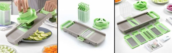 Das 6 in 1 Mandoline-Reibeisen ist das unentbehrliche Schneidegerät für die Herstellung von Gemüsescheiben und Julienne, aber auch zum Reiben von Karotten, Käse, Schokolade… Die Mandoline ist mit 6 austauschbaren Klingen ausgestattet.