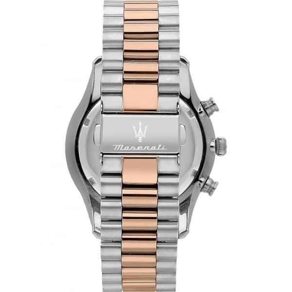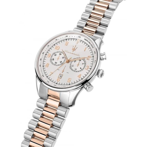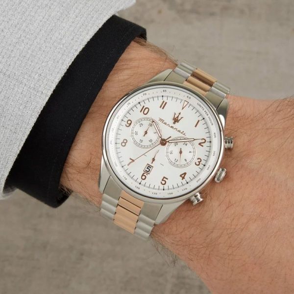 Die Maserati Herrenarmbanduhr Tradition verkörpert den raffinierten und sportlichen Geist der italienischen Marke. Mit ihrem zweifarbigen Design in Silber und Roségold vereint sie zeitlose Eleganz und moderne Akzente, perfekt für Männer, die sowohl im Alltag als auch zu besonderen Anlässen einen stilvollen Auftritt wünschen. Das weiße Zifferblatt hebt jedes Detail hervor und setzt die goldfarbenen Indizes und Zeiger besonders in Szene.