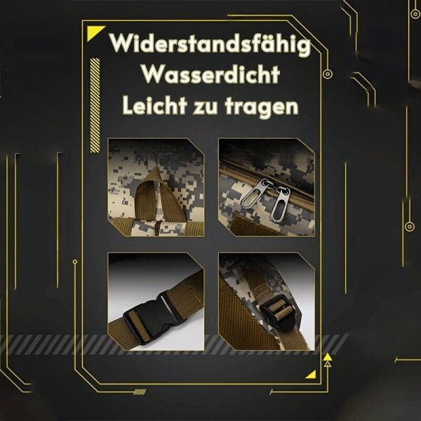 Diese Tasche ist aus wasserfestem Material gefertigt und schützt Ihre Sachen vor Wind und Wetter.