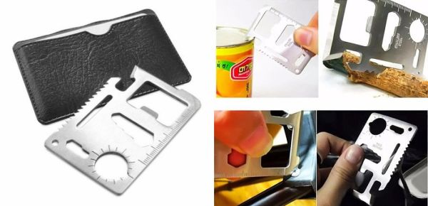 Es handelt sich um eine Multifunktionskarte aus rostfreiem Stahl mit 11 Werkzeugen in der Größe einer Kreditkarte. Verwenden Sie sie, um Flaschen und Dosen zu öffnen, kleine Äste abzusägen, Seile zu durchtrennen und vieles mehr. Ideal zum Campen oder für den täglichen Gebrauch und auch ein ideales Geschenk. Es ist sehr leicht und passt bequem in Ihr Portemonnaie oder Ihre Tasche.