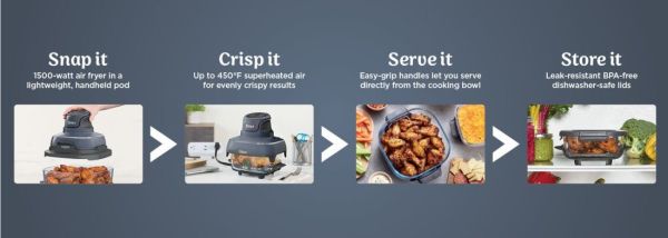 Erleben Sie Leistung, Vielseitigkeit und durchdachtes Design in Ihrer Küche mit der 4-in-1 Heißluftfritteuse aus Glas Ninja CRISPi. Kompakt und mobil vereint sie alles, was Sie brauchen, um Ihre Speisen zuzubereiten, zu garen, aufzufrischen, zu servieren und aufzubewahren – ganz gleich, ob Sie für die Familie kochen oder einzelne Portionen zubereiten.