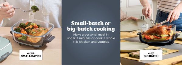 Mit zwei thermoresistenten CleanCrisp®-Glasbehältern – 3,8 L für gesellige Gerichte (ganzer Braten, Gemüse, Snacks) und 1,4 L für Einzelportionen oder kleine Snacks – zaubern Sie ein Familienessen in unter 15 Minuten oder nehmen Ihr Mittagessen mühelos mit. Die Behälter lassen sich platzsparend ineinander stapeln, und der PowerPod wird mit nur einem Klick befestigt.