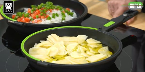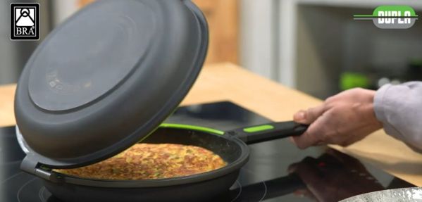 - Doppelpfanne für perfekte Omeletts: Diese Pfanne mit zwei Fächern wurde für die Zubereitung von Omeletts ohne Verbrennungsgefahr entwickelt und ermöglicht dank ihres hermetischen Befestigungssystems ein einfaches Wenden der Omeletts. Keine Spritzer und Unfälle mehr in der Küche!