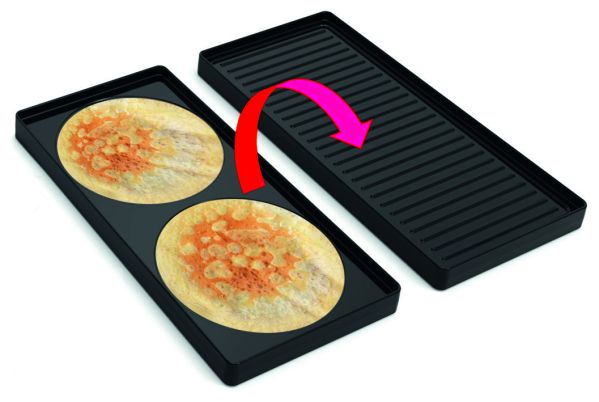 Die Gusskochplatte mit Antihaftbeschichtung ist wendbar und bietet maximale Vielseitigkeit: eine geriffelte Seite zum Grillen von Fleisch und Gemüse und eine flache Seite mit Vertiefungen, die speziell für zwei Crêpes entwickelt wurden.