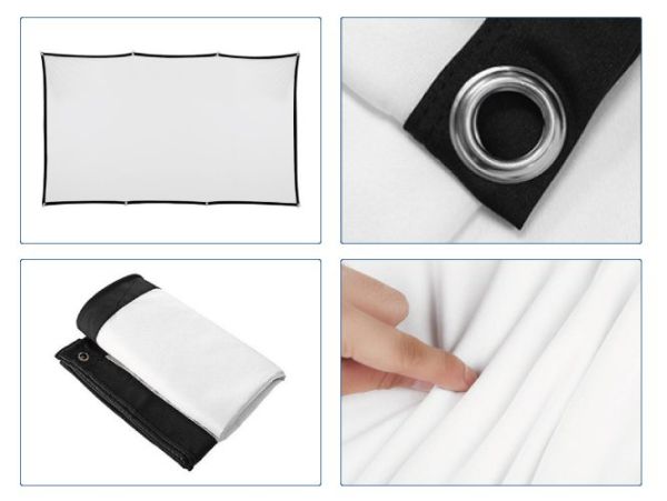 Im Lieferumfang enthalten ist eine faltbare 120-Zoll-Leinwand im 16:9-Format. Sie ist leicht, waschbar und knitterfrei und lässt sich dank der Ösen und des mitgelieferten Zubehörs in wenigen Minuten aufstellen. Ob für einen Filmabend mit der Familie, eine Vorführung mit Freunden oder eine professionelle Präsentation – sie bietet Ihnen ein echtes Großbild-Erlebnis, wo immer Sie sind.