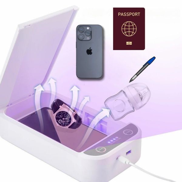 Dank seines ultravioletten Lichts mit 253,7 nm Wellenlänge beseitigt diese kompakte Box bis zu 99 % der Bakterien, Viren und Mikroorganismen – auf Telefonen, Brillen, Schmuck, Schlüsseln, wiederverwendbaren Masken, Zahnbürsten oder Fernbedienungen.