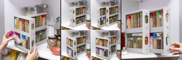 Dieser Gewürz-Organizer verfügt über 2 verschiebbare Regale in 2 Höhen und mit einem Drehwinkel von 90° für einfachen Zugriff auf die Gläser bei minimalem Platzbedarf. Es kann auch im Badezimmer oder Schlafzimmer als Medikamenten- oder Make-up-Organizer verwendet werden.