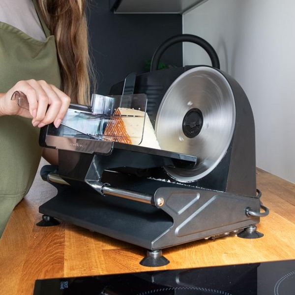 Das schwarze Metallgehäuse verleiht der Rock'nCut Aufschnittmaschine ein innovatives und minimalistisches Design, das sich harmonisch in moderne Küchen einfügt. Die Komponenten aus Edelstahl, insbesondere der Schlittenabdeckungen und die Klinge, sorgen für hohe Widerstandsfähigkeit, langanhaltende Schärfe und eine lange Lebensdauer.