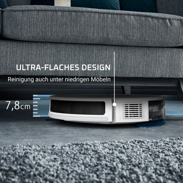 Mit seinem schlanken Profil und dem modernen Design passt dieser Roboterstaubsauger auch unter niedrige Möbel und fügt sich unauffällig in jede Einrichtung ein. Dank seiner geringen Höhe kann er auch schwer zugängliche Stellen reinigen und verleiht Ihrem Zuhause gleichzeitig einen eleganten Touch.