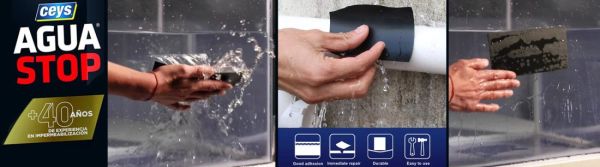 Entdecken Sie das CEYS Instant Water Stop Tape. Das EINZIGE selbstklebende Band, das Wasseraustritte INSTANT stoppt, in Nassbereichen und sogar unter Wasser.