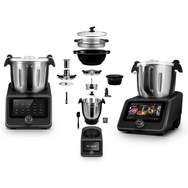 PowerChef zeichnet sich durch sein kompaktes und elegantes Design aus und macht eine Vielzahl von Küchenutensilien und Elektrogeräten überflüssig. Er ersetzt mühelos Waage, Mixer, Zerkleinerer, Schneebesen und sogar Pfannen und Töpfe, wobei er mit seiner mattschwarzen Verkleidung eine raffinierte Eleganz bewahrt.