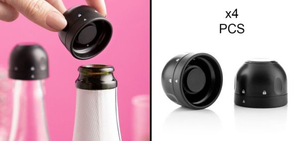 Ein Set aus 4 Stöpseln für Champagnerflaschen, in einem modernen und eleganten Design, mit denen Sie die Flaschen wieder hermetisch verschließen können. Ihr einfaches Verschluss-System verhindert das Austreten der Kohlensäure aus dem Getränk, wodurch der Inhalt der Flasche länger wie frisch geöffnet bleibt.