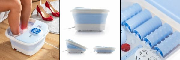 Dieses klappbare Fußbad mit Hydromassage ist ideal zum Entspannen und zur Pflege der Füße. Es verfügt über Sprudel, Wärme, Behälter für Badesalze und Massagerollen mit Noppen. Das Fassungsvermögen beträgt 10 Liter und die Leistung 500 W.