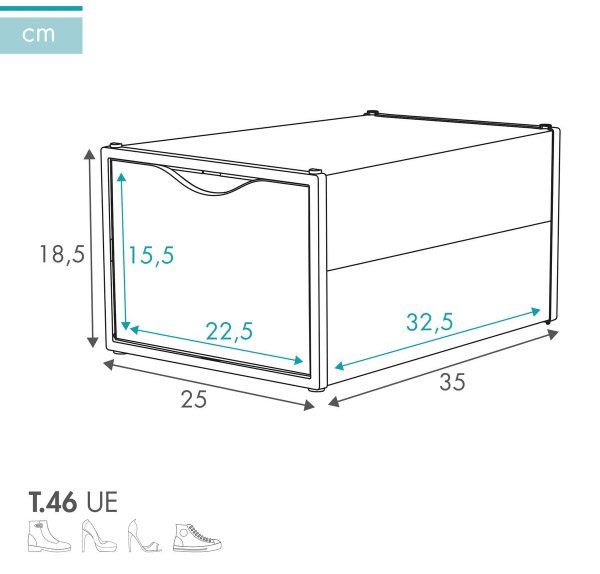 MAX Home Boxen sind geräumig genug, um Schuhe bis zur Größe 46 aufzunehmen, was sie zu einer geeigneten Aufbewahrungslösung für alle Arten von Schuhen macht. Egal, ob Sie Turnschuhe, Stiefel oder Straßenschuhe haben, diese Boxen bieten genügend Platz, um Ihre Paare zu schützen, ohne sie zu verformen. Die Außenmaße jeder Box (25 x 18,5 x 35 cm) sind so gestaltet, dass sie sich an die Bedürfnisse der Benutzer anpassen, egal ob sie kleine oder große Schuhe haben.