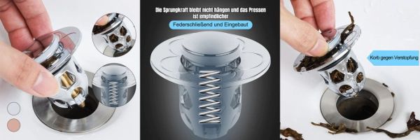Sehr guter Anti-Verstopfungsfilter. Der Pop-Up-Mechanismus funktioniert zuverlässig und das Innensieb fängt Haare effektiv auf. Ich habe ihn auch in der Küche eingebaut und bin sehr zufrieden