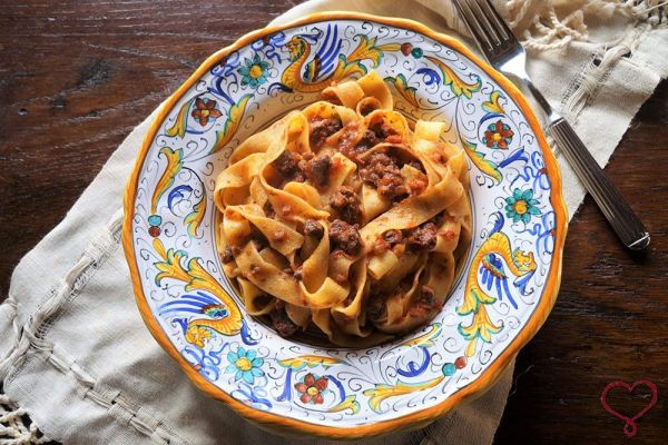 - Pappardelle, breite Nudelstreifen, die mit einer Wildschwein-Ragù-Soße serviert werden, bieten eine Mischung aus robusten Aromen, die mit den würzigen und fruchtigen Noten des Weins harmonieren.