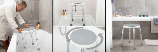 - Drehbarer Sitz: Dieser verstellbare Badhocker verfügt über einen um 360° drehbaren Sitz. Sein innovatives Drehsystem erleichtert das Ein- und Aussteigen aus der Dusche und reduziert die körperliche Anstrengung des Benutzers und seiner Pflegekraft während der Körperpflege.