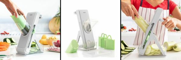 Eine der größten Stärken dieser Mandoline ist ihr kompaktes, zusammenklappbares Design, das sie ideal für Küchen jeder Größe macht. Sie passt problemlos in eine Schublade oder lässt sich mühelos in einem Schrank verstauen, sodass Sie Platz sparen und trotzdem immer griffbereit sind.