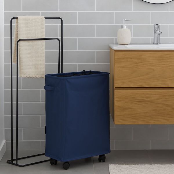 Sehr praktisch – faltbar und mit Rollen ausgestattet. Der Stoff ist robust, der Rahmen stabil. Passt auch in kleine Waschräume.