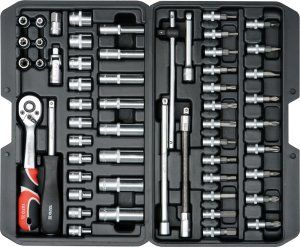 Dieser Koffer enthält ein komplettes Sortiment an unentbehrlichen Werkzeugen, darunter reguläre und tiefe Steckschlüssel, Sternsteckschlüssel, Verlängerungen, eine flexible Verlängerungsstange, ein Universalgelenk, einen T-Griff, eine abgewinkelte Knarre mit TPR-Griff für ergonomisches Arbeiten, einen Spinnergriff für schnelles und effizientes Anziehen sowie eine Vielzahl von Biteinsätzen, die für alle Aufgaben geeignet sind.