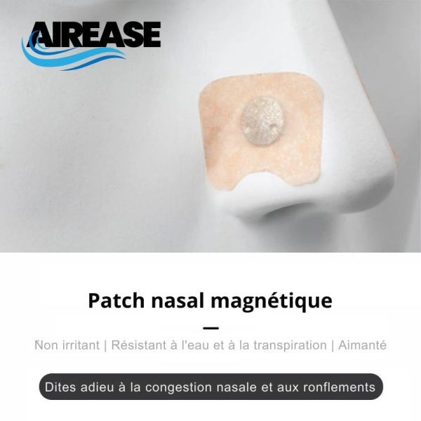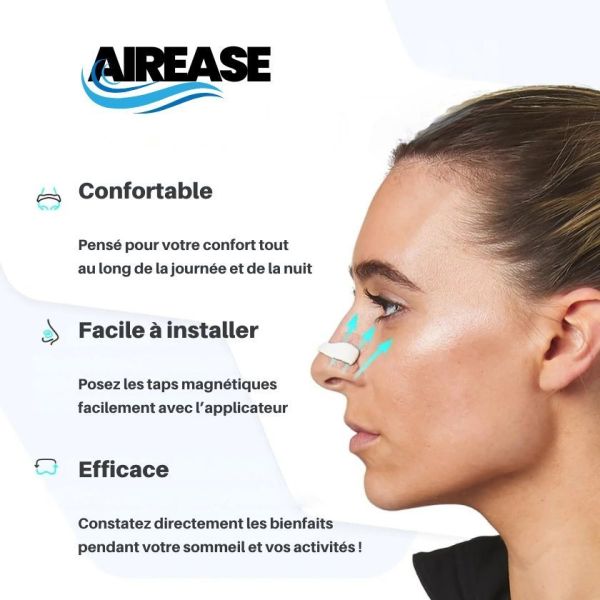 Les bandes nasales magnétiques AirEase™ sont conçues pour ouvrir délicatement vos narines, maximisant ainsi le flux d'air pour une meilleure oxygénation et un sommeil réparateur.