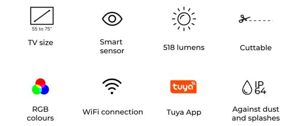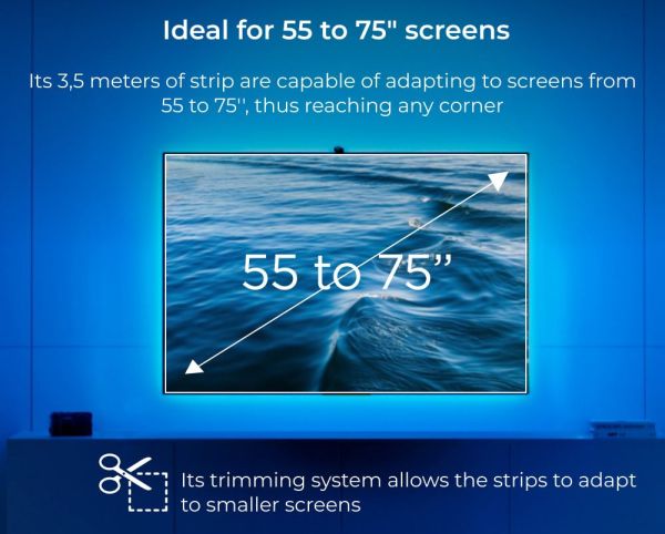 La taille des bandes LED est compatible avec les téléviseurs de 55 à 75 pouces. Leur installation est très simple, et elles sont taillables, ce qui signifie qu'une fois installées sur votre téléviseur, vous pouvez les couper et vous débarrasser de la partie des bandes qui vous reste. Elles ont une longueur de 3,5 mètres et un indice de protection IP64, ce qui les rend résistantes à la poussière et aux éclaboussures. De plus, avec une durée de vie de 36 000 heures, l'AmbiGlow sera votre fidèle compagnon pendant de nombreuses années.