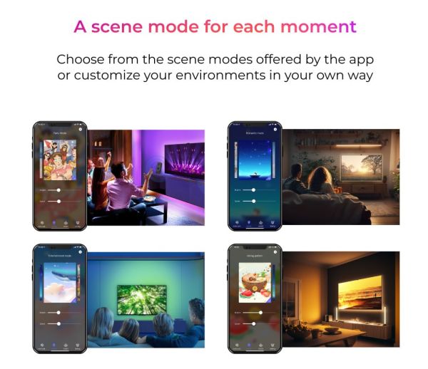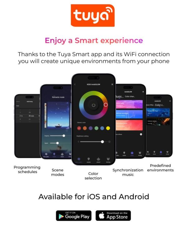 Vous pouvez utiliser toutes les fonctionnalités de l'AmbiGlow grâce à l'application Tuya Smart. Choisissez la couleur que vous souhaitez, découvrez les modes de scène et réglez les minuteries en quelques secondes. L'AmbiGlow dispose d'une connexion WiFi pour que vous puissiez contrôler toutes ses fonctions et intègre le Bluetooth 4.2 pour toujours garantir une connexion stable. De plus, il intègre une unité de contrôle afin que vous puissiez contrôler la bande LED lorsque vous n'avez pas votre téléphone portable à portée de main, ou que vous n'avez plus de batterie.