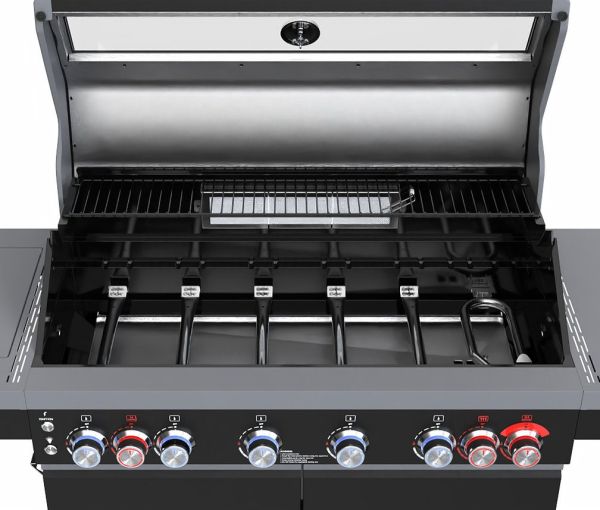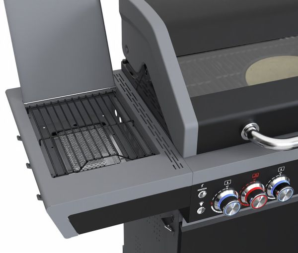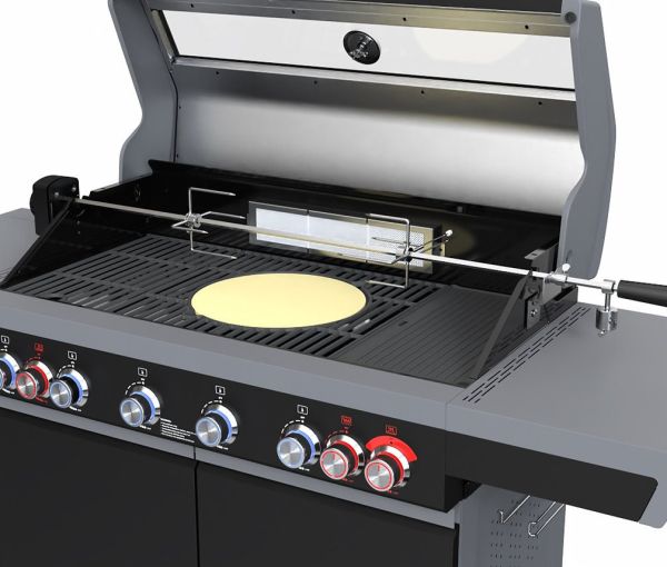 | Fonctionnalités supplémentaires | Rôtissoire et plaque à pizza, Grille de maintien au chaud en acier, Plaque réversible (grill/plancha), Tables d'appoint avec crochets, Panier latéral et porte de rouleau papier, Lumières LED sur les boutons, Allumage par impulsion, Couvercle avec fenêtre en verre |
