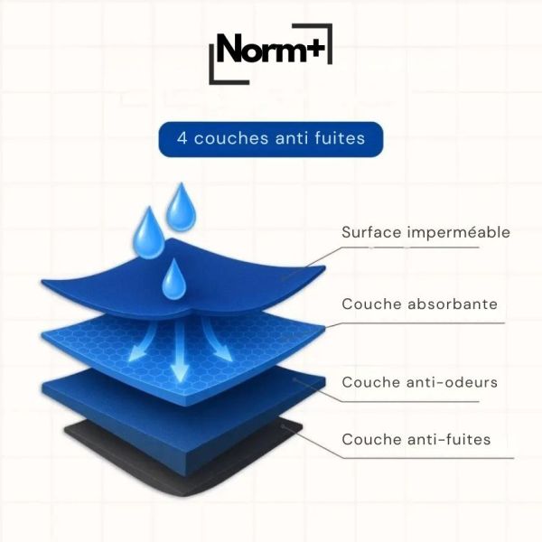 ✅ Technologie 4 couches anti-fuites – Surface imperméable, couche absorbante, barrière anti-odeurs et base étanche.