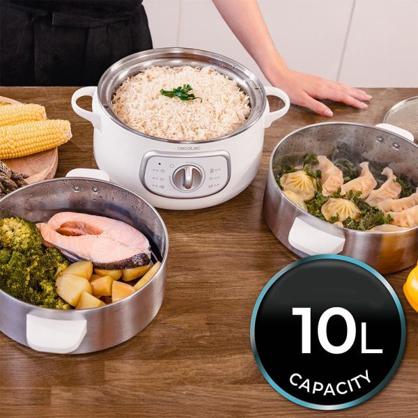 Avec ses 3 paniers vapeur et une capacité totale de 10 litres, ce cuiseur permet de cuisiner jusqu'à trois plats en même temps. Il offre ainsi un gain de temps considérable et une grande flexibilité pour préparer des repas complets en une seule utilisation.