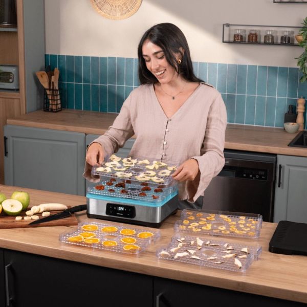 Grâce à ses 5 plateaux amovibles et réglables en hauteur, vous disposez d'un espace généreux pour déshydrater plusieurs aliments simultanément. Que ce soit pour sécher des rondelles d'orange, des mangues, des champignons ou encore des herbes aromatiques, chaque plateau s'adapte à vos besoins, maximisant ainsi votre productivité en cuisine.