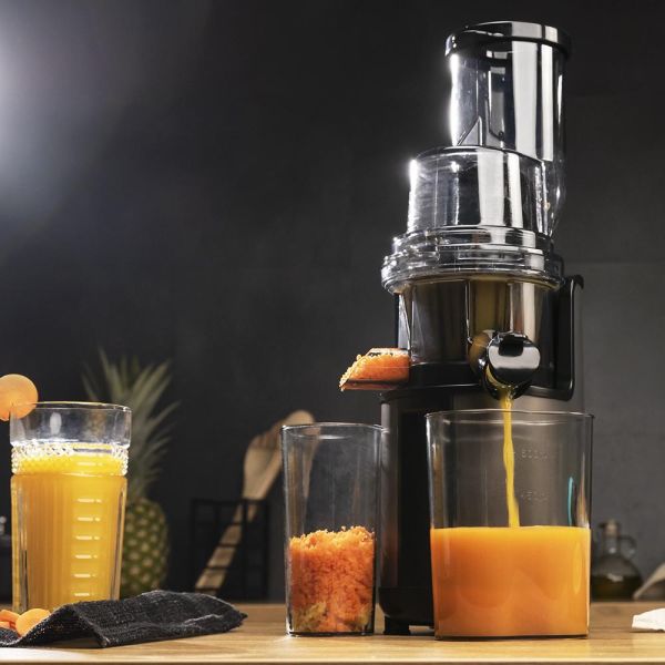 Son tube d'embouchure XL permet d'introduire des fruits et légumes entiers, réduisant ainsi le temps de préparation. Grâce à ses deux entrées pratiques, il s'adapte facilement à tous types d'ingrédients, des pommes aux carottes en passant par les concombres ou tomates. Plus besoin de découper systématiquement vos aliments : un vrai gain de temps au quotidien.