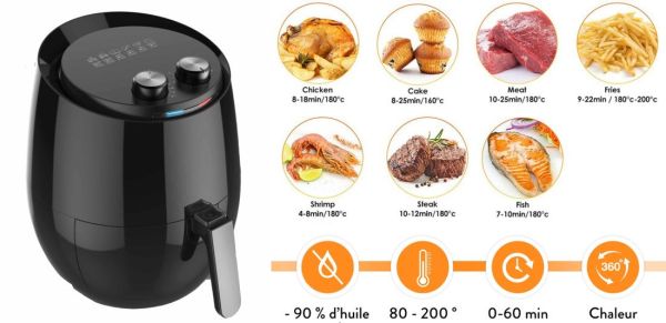 Avec un volume de 3,2 litres, cette friteuse à air chaud est idéale pour vous. Faire cuire des frites, des snacks, des cuisses de poulet, des pommes de terre tranchées, du poisson, mais aussi de nombreux autres aliments à la friteuse n'a jamais été aussi sain grâce à une cuisson sans huile.
