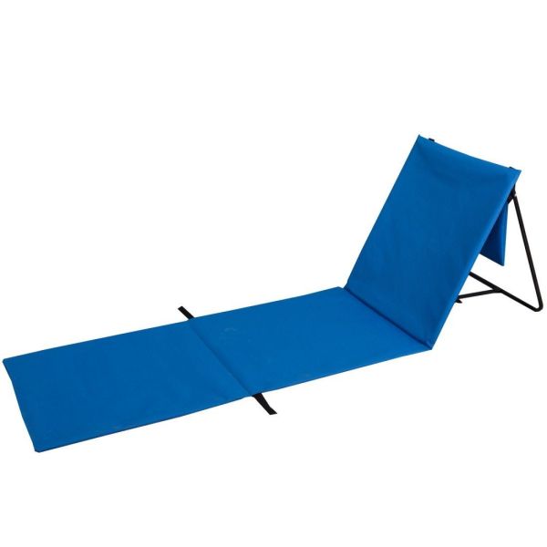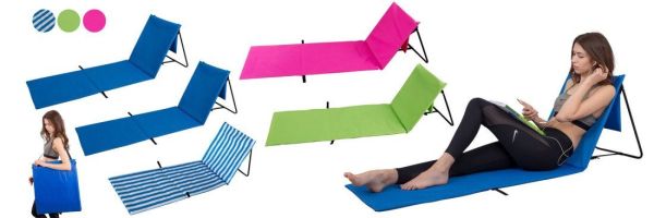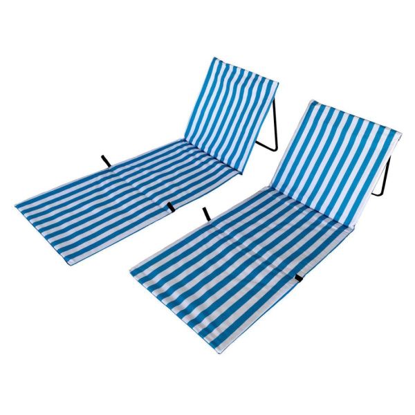 Conçus pour résister aux usages extérieurs, ces tapis sont équipés d'une armature métallique discrète assurant une bonne stabilité du dossier, même sur des terrains irréguliers. Le revêtement en tissu (coloris visibles : bleu, rayé, vert, rose) est agréable au toucher et facile à nettoyer, pour un entretien sans souci après chaque utilisation.